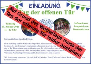 Auf Grund der angekündigten Wetterlage für die nächsten Tage, haben wir uns dazu entschieden, den Tag der offenen Tür abzusagen. Wir bitte um Ihr Verständnis. Sollten Sie noch Beratungsbedarf haben, so vereinbaren Sie gerne einen Termin über unser Sekretariat!
